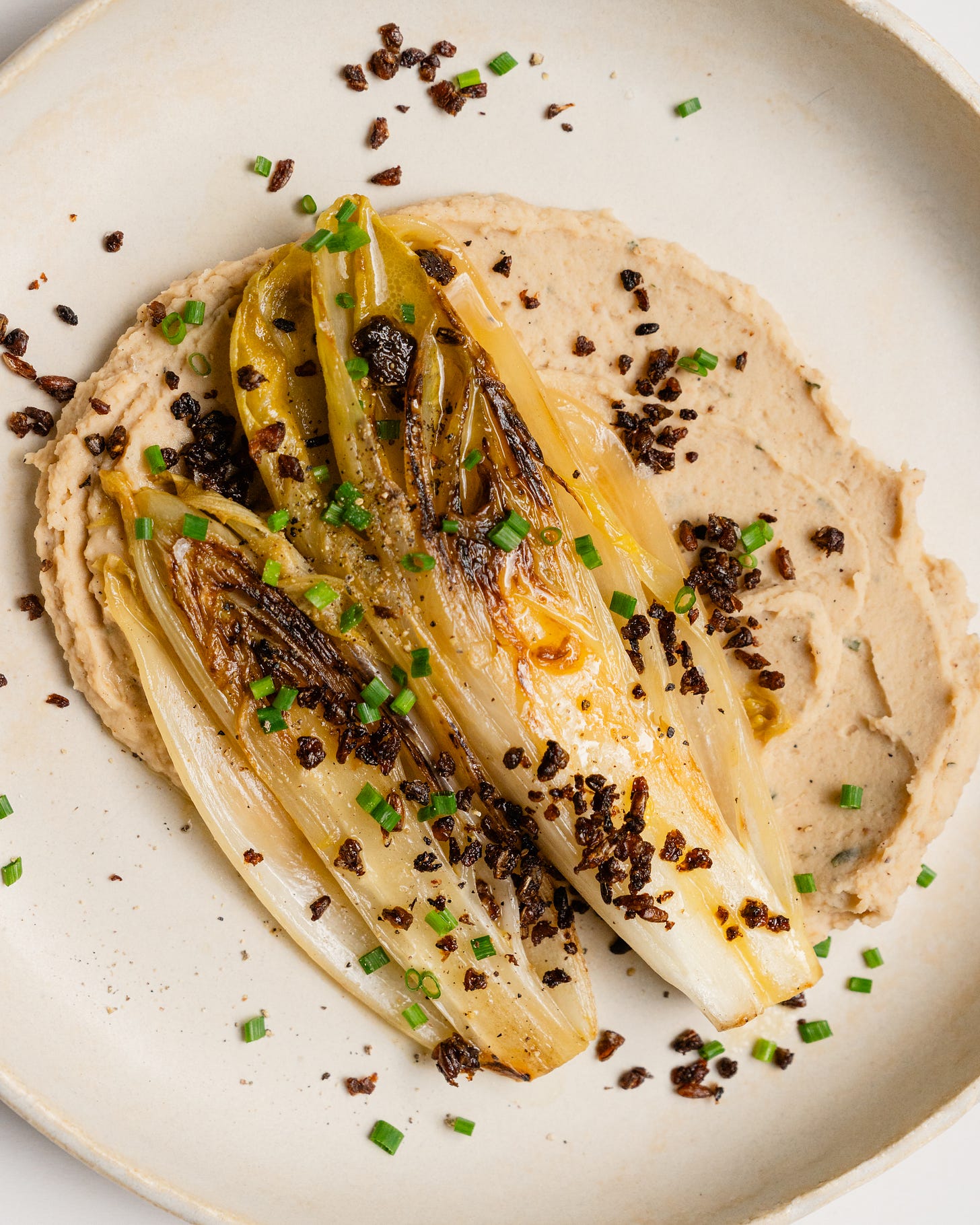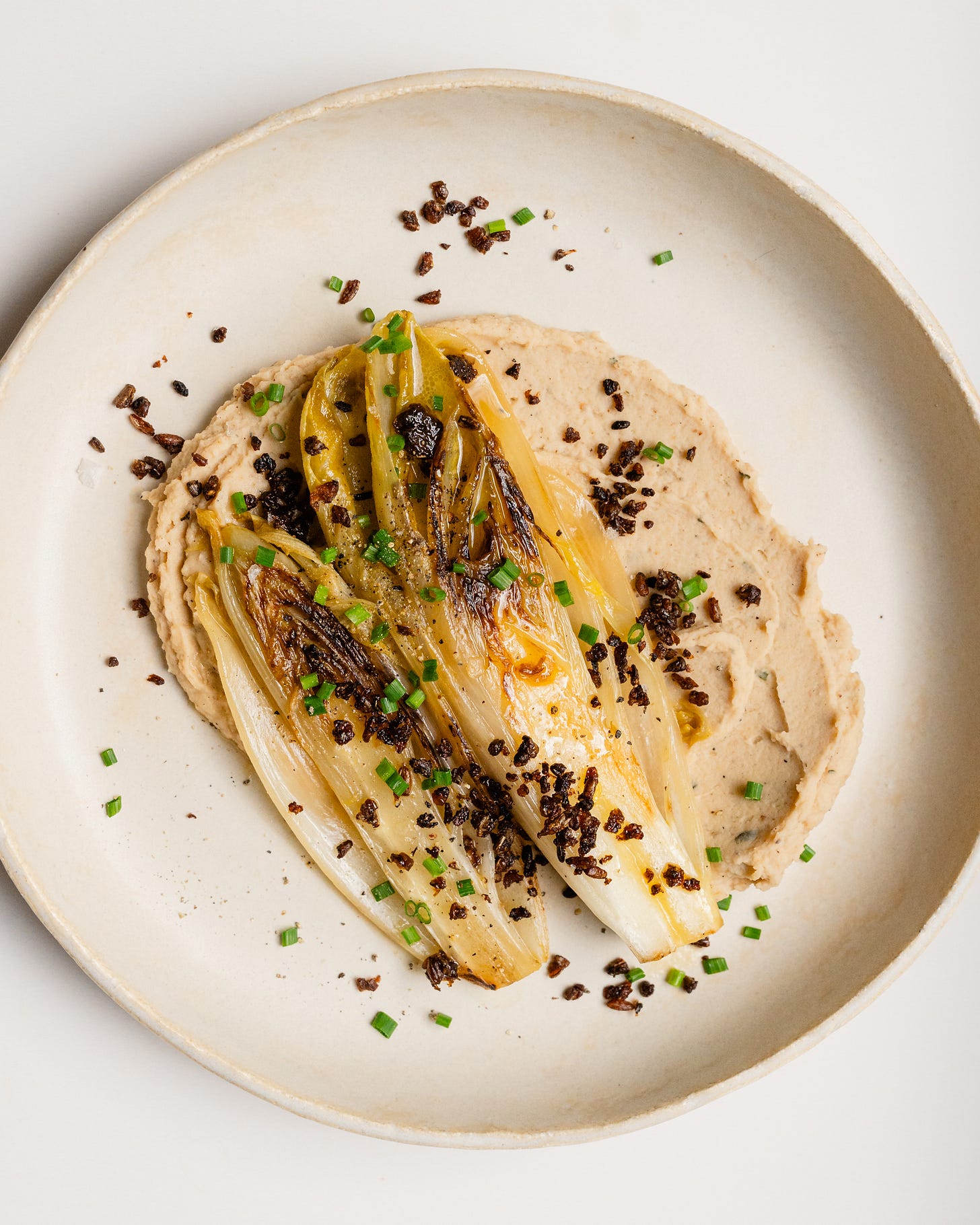 Rezept: Gebratener Chicorée mit Pumpernickelknusper, weißem Bohnenpüree und Beurre Blanc