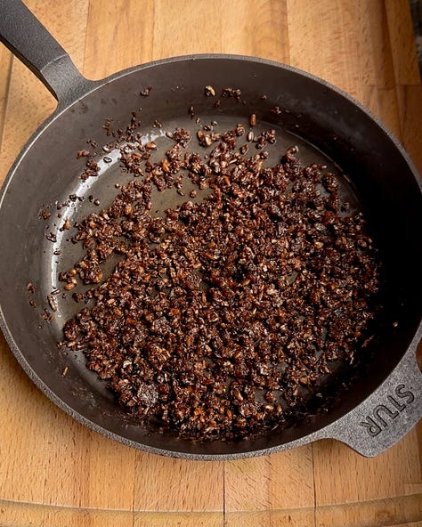Eine Pfanne auf mittlere Hitze vorheizen und etwas Olivenöl hinzufügen. Die Pumpernickelscheibe in kleine Krümel zerbröseln und in der Pfanne knusprig anbraten. Mit einer Prise Salz würzen. Die knusprigen Pumpernickelkrümel beiseite stellen.