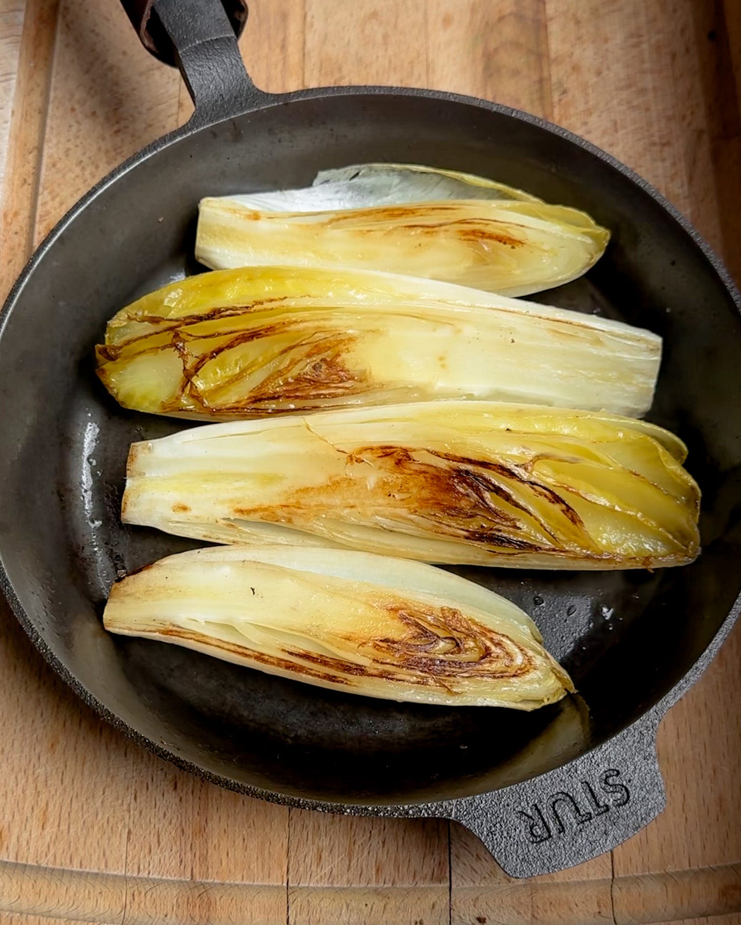 Die Chicorée längs halbieren und in derselben Pfanne mit Olivenöl und Salz anbraten, bis sie eine goldbraune Farbe annehmen. Dann die Chicorée-Hälften umdrehen, mit Weißwein, einem Schuss Wasser und Orangensaft ablöschen und ca. 5 Minuten lang leicht einköcheln lassen, bis der Chicorée gegart ist.